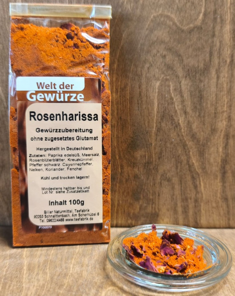 Zutaten: Paprika süß, Meersalz, Rosenblütenblätter, Kreuzkümmel, Pfeffer schwarz, Cayennepfeffer, Nelken, Coriander, Fenchel