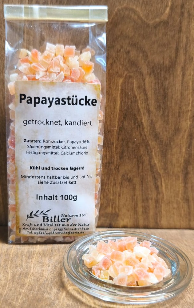 Zutaten: Rohrzucker, Papaya 36%, Säuerungsmittel: Citronensäure, Festigungsmittel: Calciumchlorid